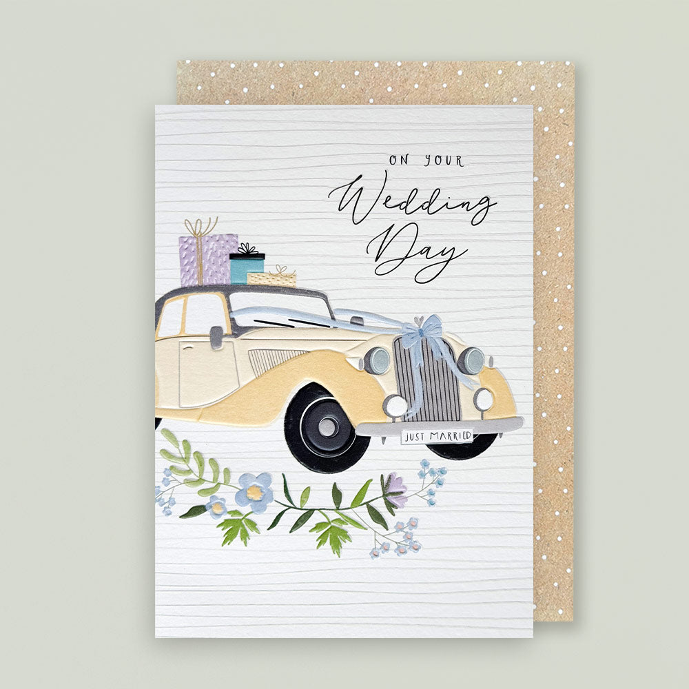 Card size when packed: 125 x 175mm The Eden Collection Containing subtle hints to our award winning Halcyon Collection, our newest everyday range see's exquisite illustrative designs paired with subtle colour palettes. This particular card features a vintage wedding car design, with the caption 'on your Wedding Day'. Each design features a deep emboss and comes printed on FSC accredited board, finished sympathetically with a brown polka-dot kraft envelope.