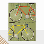 Caption: Happy Birthday Card size when packed: 125 x 175mm The Eden Collection Containing subtle hints to our award winning Halcyon Collection, our newest everyday range see's exquisite illustrative designs paired with subtle colour palettes. This particular male card features a couple of retro bikes, with the caption 'Happy Birthday'. Each design features a deep emboss and comes printed on FSC accredited board, finished sympathetically with a brown polka-dot kraft envelope.