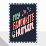 Caption: Favourite Human Card size when packed: 125 x 175mm The Fontfetti Collection. Our latest typography range featuring modern captions combined, striking colour-ways & a deep emboss. This contemporary collection is perfect for all age groups, and comes complete with a black & white striped envelope. This particular Fathers Day design features the caption 'My Favourite Human'.