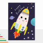 This particular design features a sprightly space rocket and is perfect for anyone celebrating their birthday.